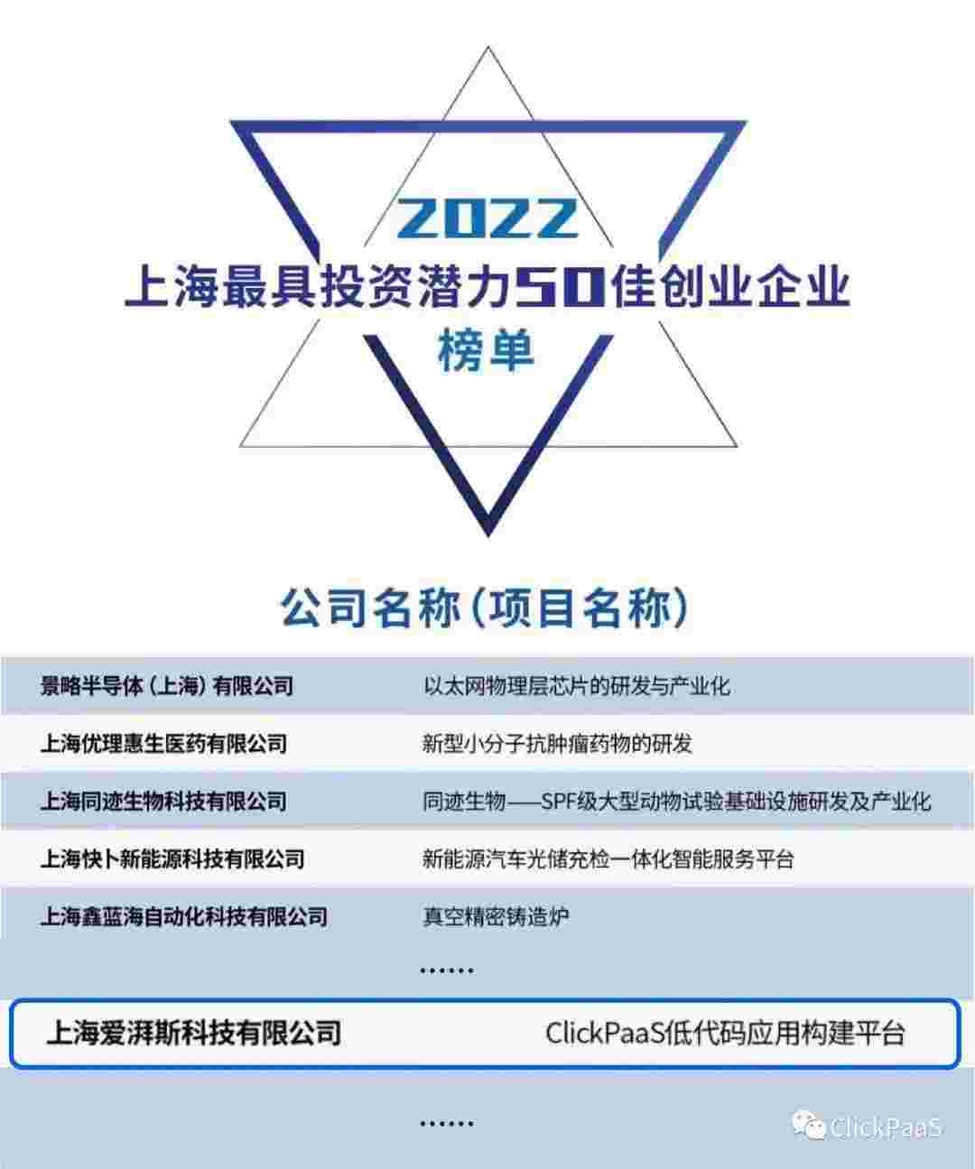 NO钱包 作为国内低代码PaaS平台的领军企业,,,,与120家创企入围角逐。。期间接受了来自德同资本、、领中资本等知名投资机构的10位投资人组成专家评委团的背靠背盲选。。。。并最终入围“2022上海最具投资潜力50佳创业企业”榜单,,,被列入“上海市重点培育创业企业库”。。