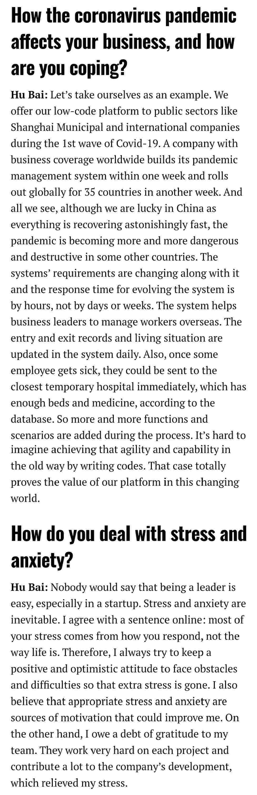 2021年年初,,,,爱湃斯科技CEO胡柏受邀接受法媒Startup.info的专访,,,与Startup info的读者分享了自己的创业经历、、以及低代码平台NO钱包的创新之处。。