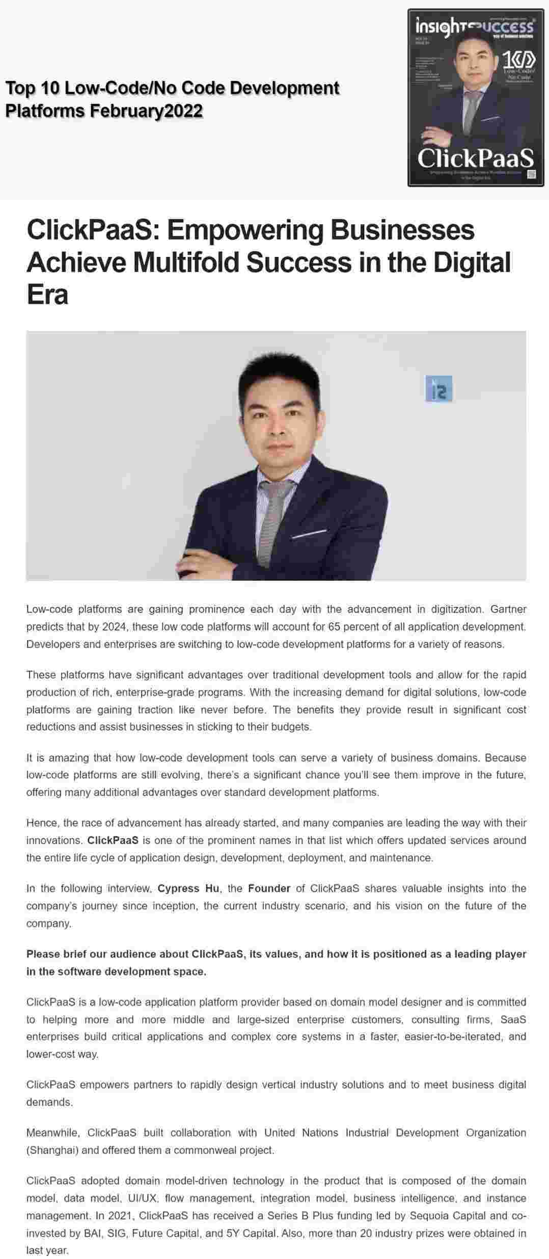 2022年年初,,NO钱包入选外媒Insights Success低代码/无代码开发平台 Top10,,,,创始人、、CEO胡柏受邀接受专访并荣登封面人物,,,,他与Insights Success的读者分享了NO钱包成立的初心、、、、发展历程、、、、当前的行业发展趋势以及他对公司未来的展望。。。。